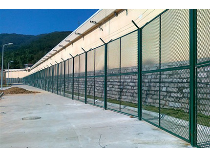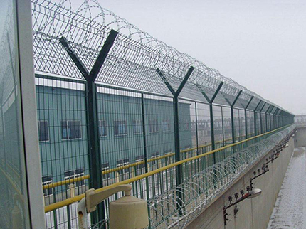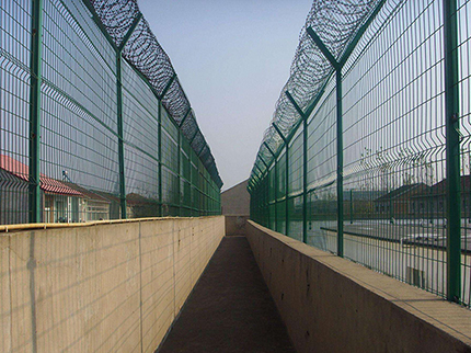 監獄圍欄主要是采用高強度的刀片刺網與普通防護網的結合,由V型支架立拄,加強型焊接片網,安全防盜連接件和刀片刺網組成.刀片刺網是一種新型防護網,由銳利尖角鍍鋅鋼板或不銹鋼薄板做刀片,鋼絲做芯線組合而成的防護器材。