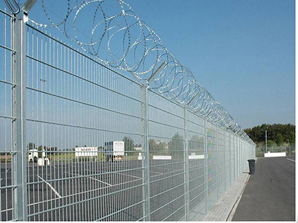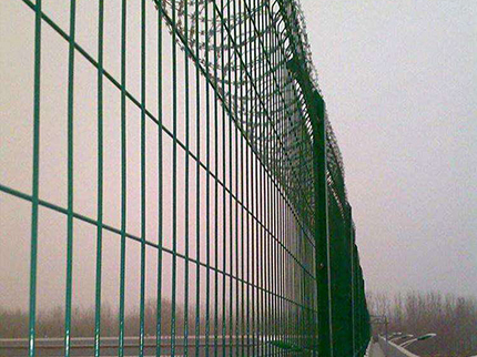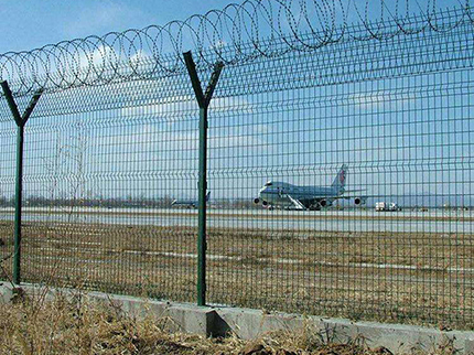 注:如果在機場隔離網(wǎng)頂部加裝刀片刺絲、刀片刺繩后又很好的增強了安全防護(hù)性能。采用電鍍、熱鍍、噴塑、浸塑等防腐形式,具有很好的抗老化、抗曬、耐候等特點。其產(chǎn)品造型美觀、花色多樣,既起到圍欄作用,又起到美化作用。由于具有安全性高、防攀爬能力好,網(wǎng)片連接方式采用特制SBS緊扣件,有效防止人為的破壞性拆卸,橫向四道折彎加強筋,使網(wǎng)面強度顯著增加。